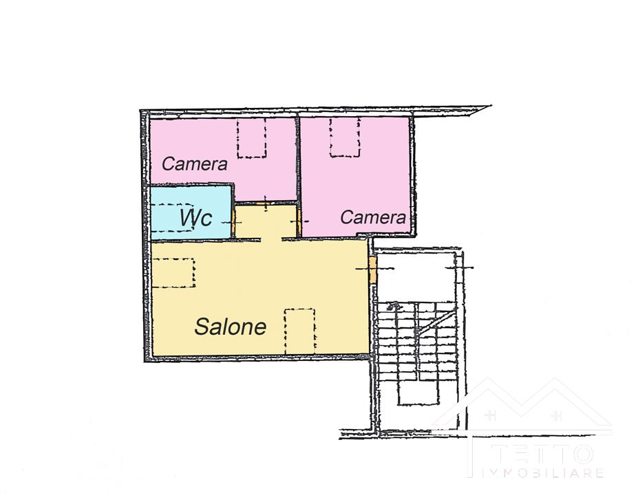 L'immobile, situato al secondo ed ultimo piano di una piccola palazzina, si compone di un luminoso soggiorno con angolo cottura, due camere da letto e un bagno.